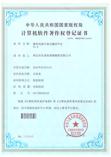 計(jì)算機(jī)軟件注冊(cè)權(quán)登記證書(shū)——整流電源開(kāi)放式測(cè)試平臺(tái)V1.0
