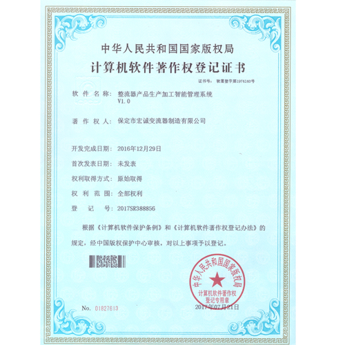 計(jì)算機(jī)軟件注冊(cè)權(quán)登記證書(shū)——整流器產(chǎn)品生產(chǎn)加工智能管理系統(tǒng)V1.0