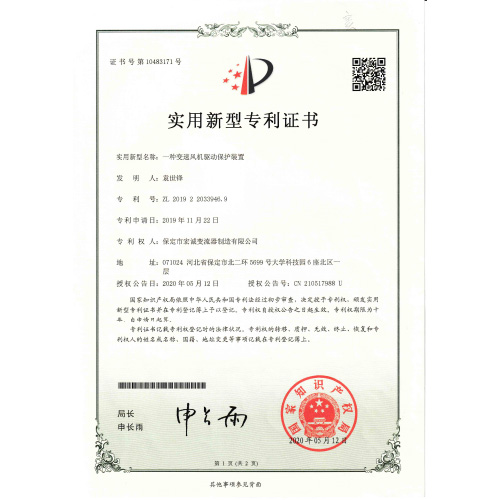 實(shí)用新型專(zhuān)利證書(shū)一種變速風(fēng)機(jī)驅(qū)動(dòng)保護(hù)裝置