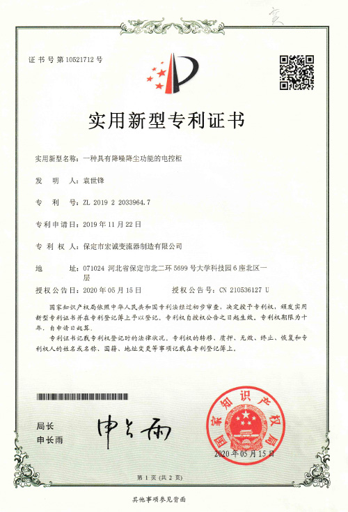 實(shí)用新型證書(shū)一種具有降噪降塵功能的電控柜